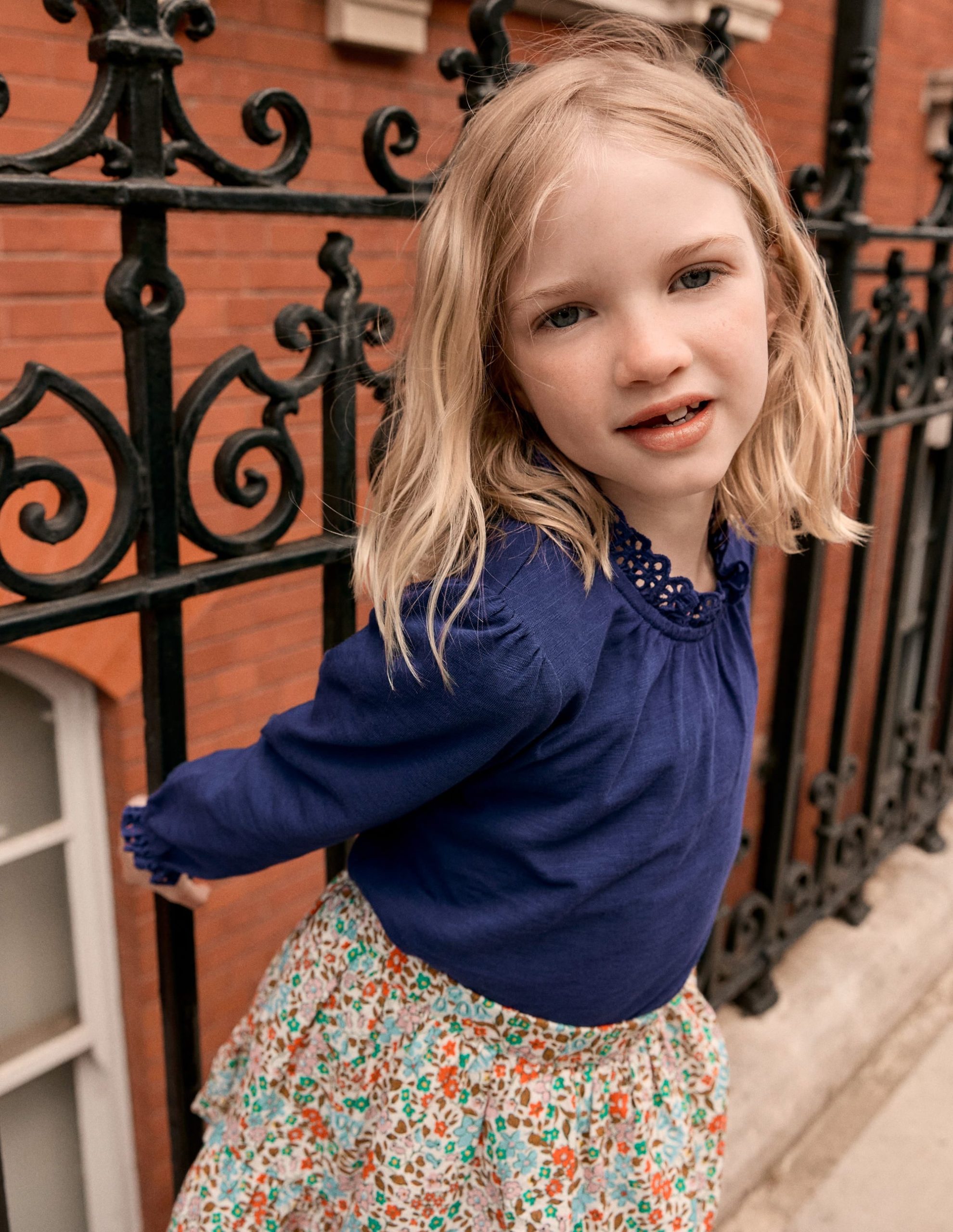 A basic top made special with broderie trim. blouson sleeves and frilly (elasticated) cuffs. The soft jersey fabric and swing shaped body encourages easy movement. Add a floaty skirt and a merry band of pals.