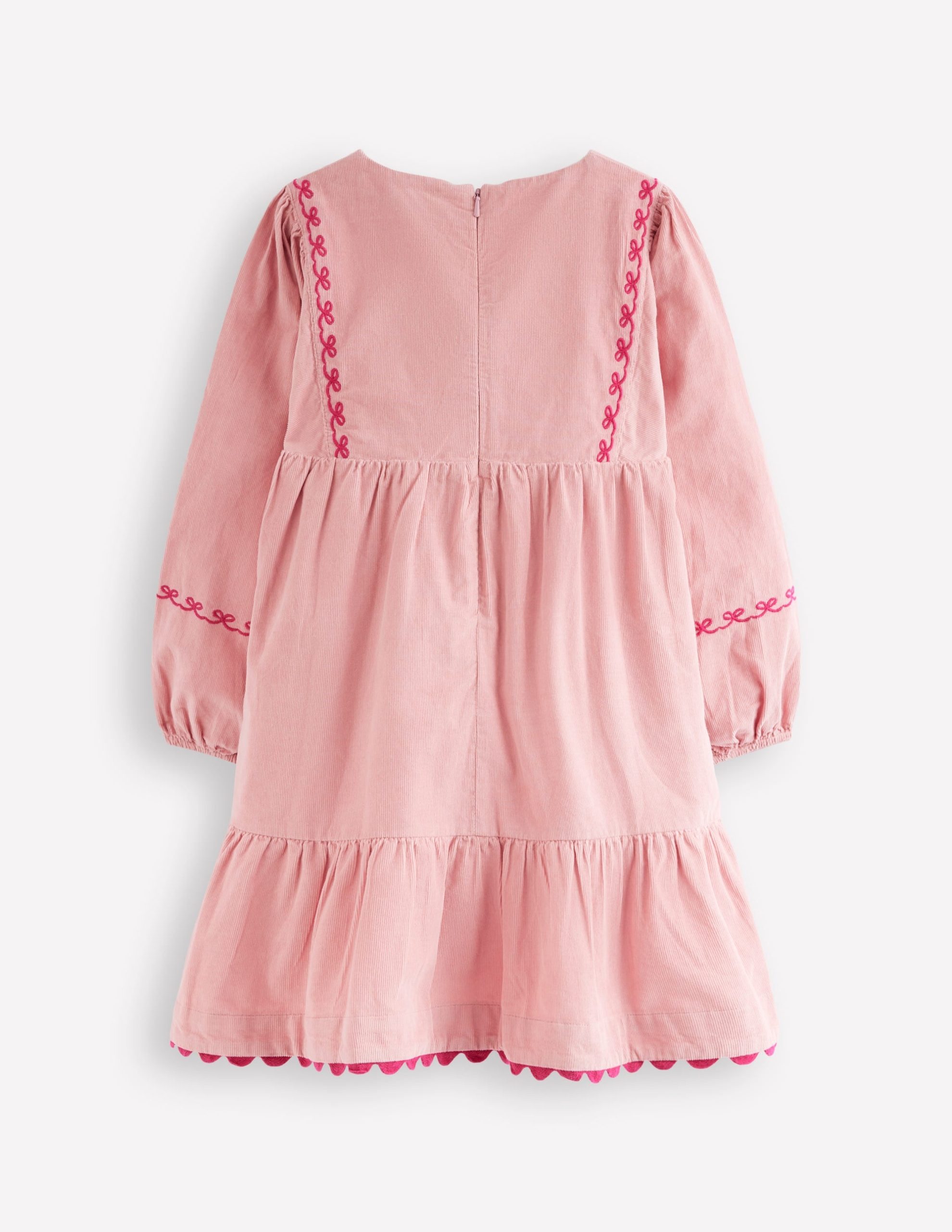 If you’re looking for a dress to treasure for years (and generations) to come. this adorable cord style is the one. It has a sparkly embroidered design. blouson sleeves and gentle gathers finished with ric rac trim.