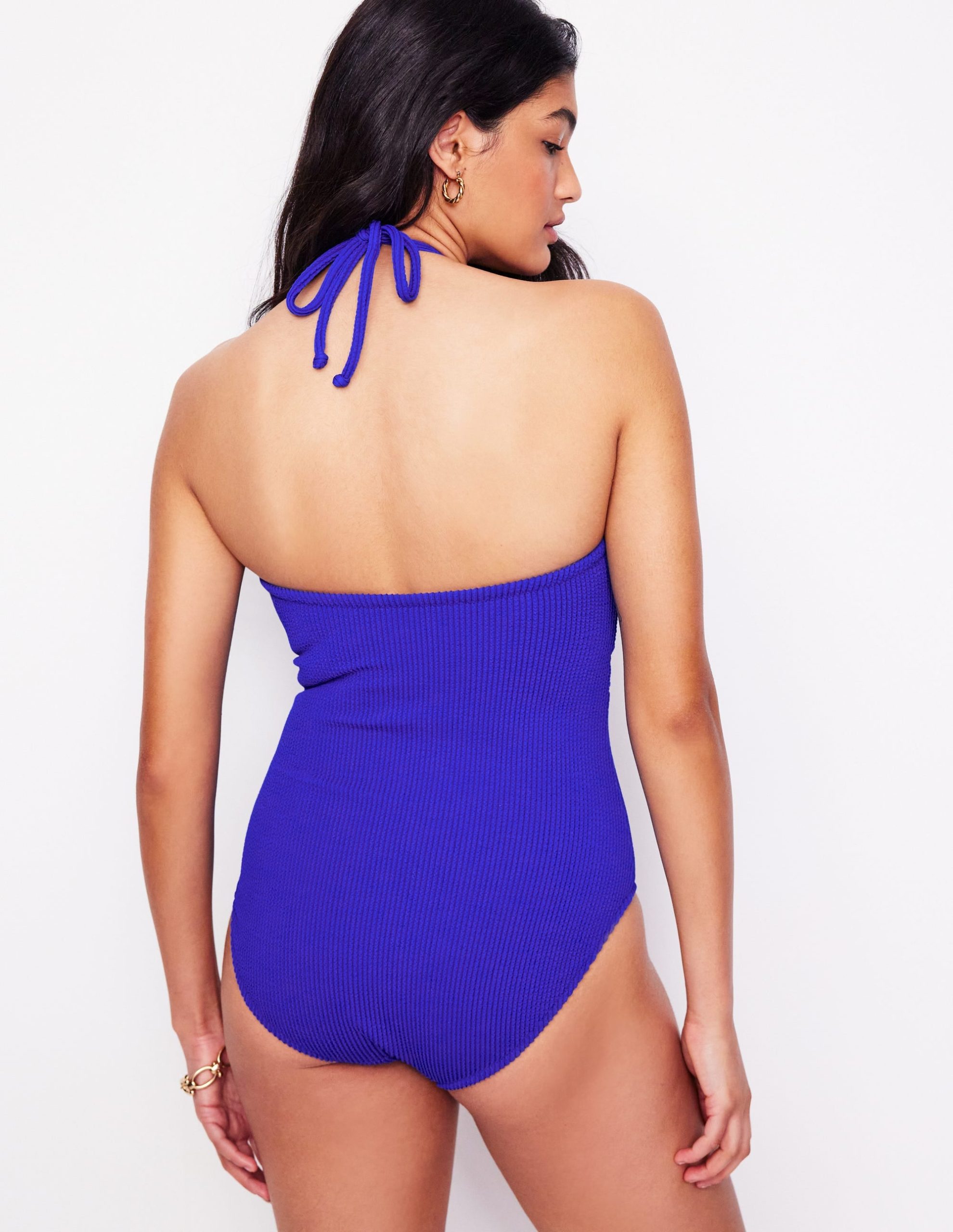 Maximise style and minimise tan lines with this swimsuit. Its halterneck can be easily adjusted or untied for a versatile look. while the crinkly texture adds retro playfulness.