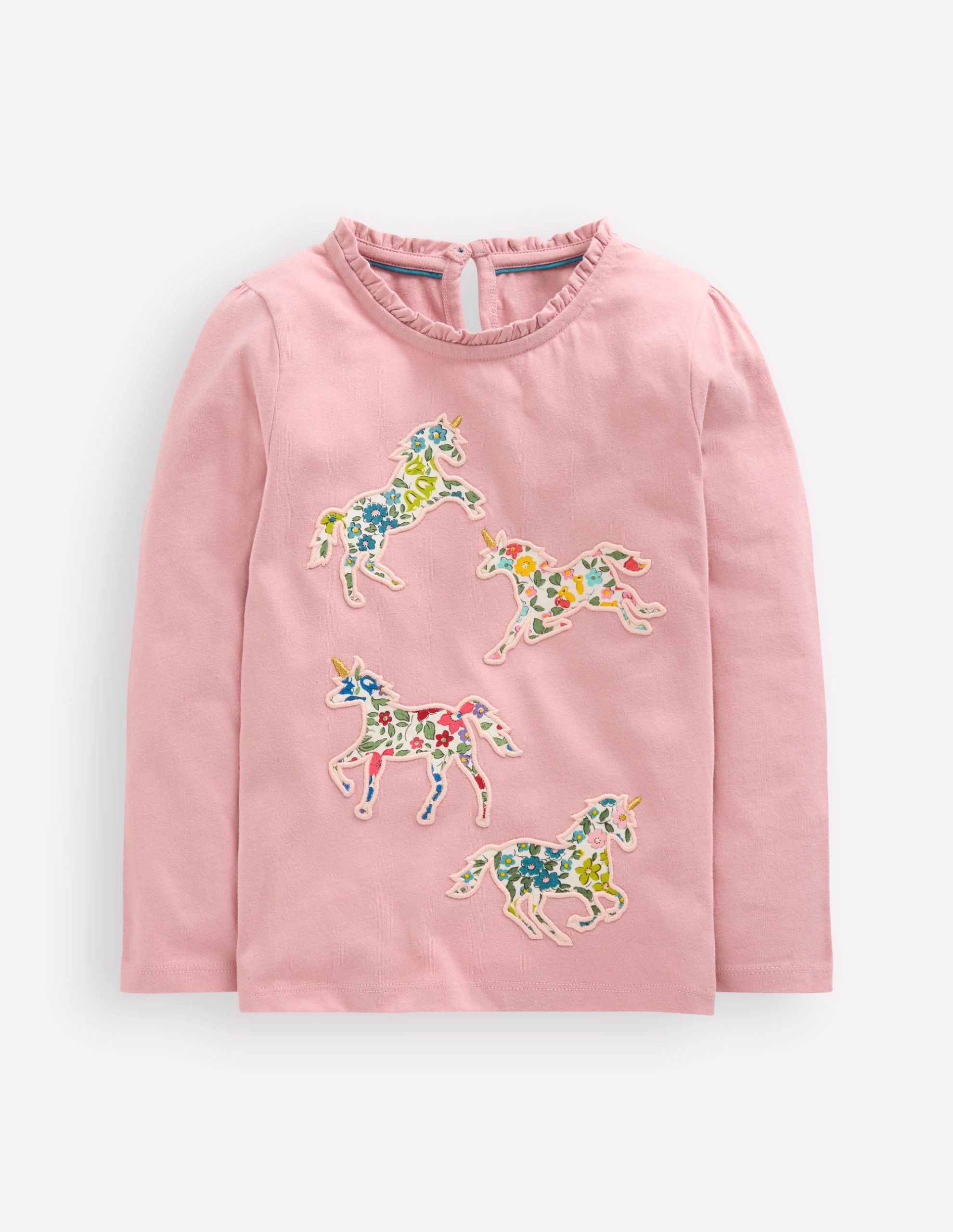 Frill Neck Appliqu?? T-shirt-Vintage Pink Unicorn