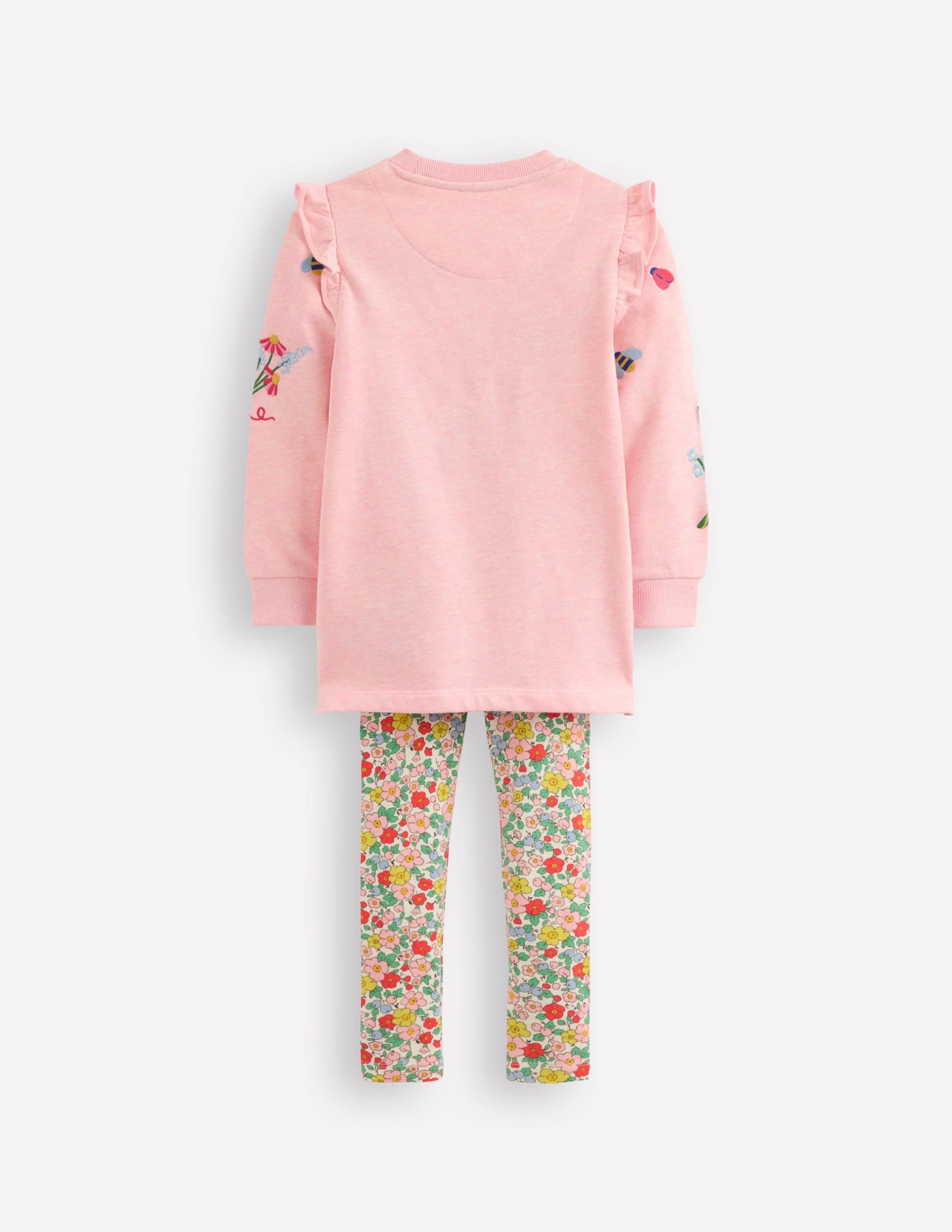 A pretty tunic set which suits playdates. playgrounds and anything in between. It has delicate embroidered detail on the snuggly tunic top. plus coordinating printed leggings.