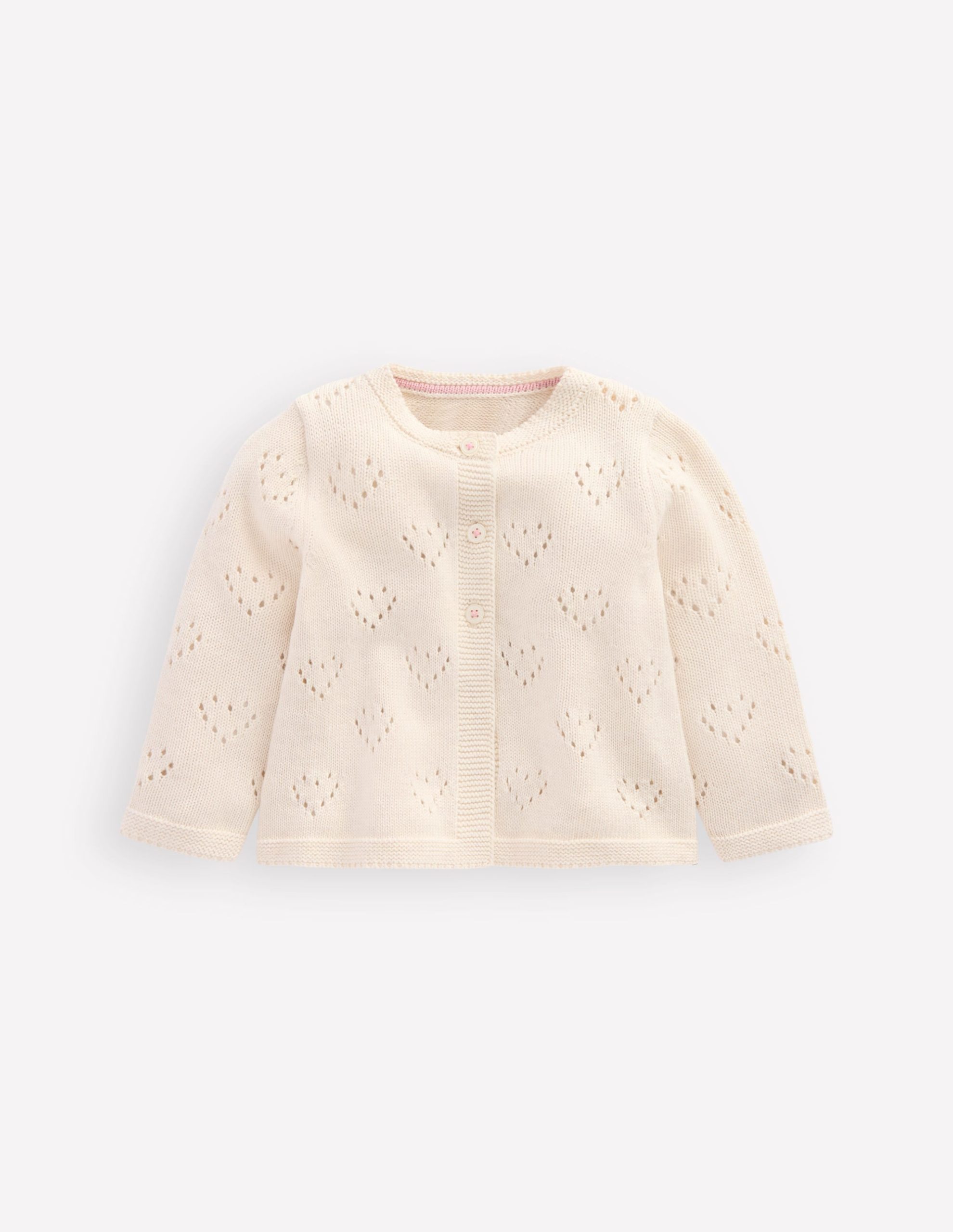 Made from 100% cotton. this cardigan is soft on gentle skin. It has an adorable heart pointelle pattern. too.