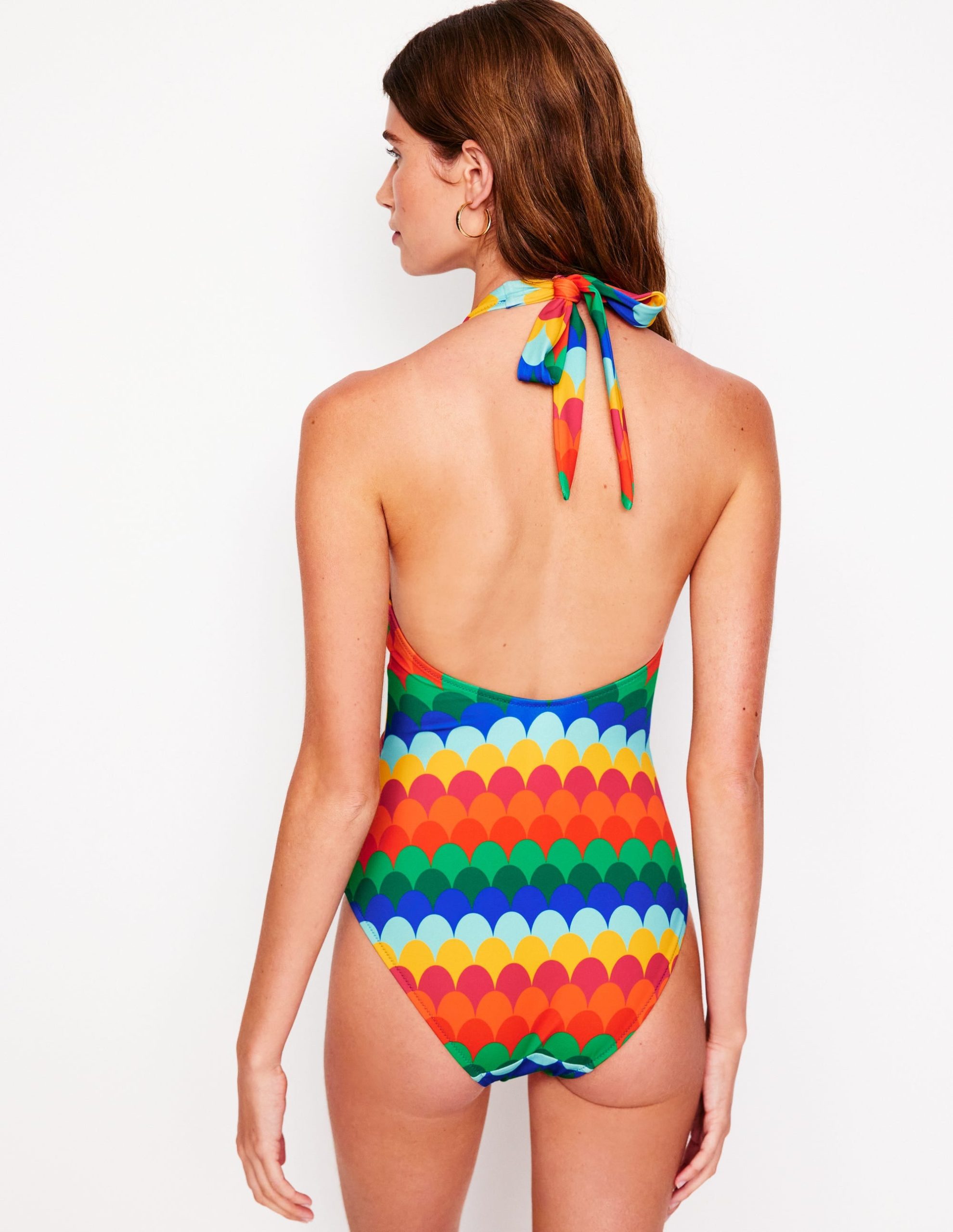 The halter neck. ruching and flattering vertical stripes make this vintage-inspired swimsuit a real keeper for this season and many more to come.