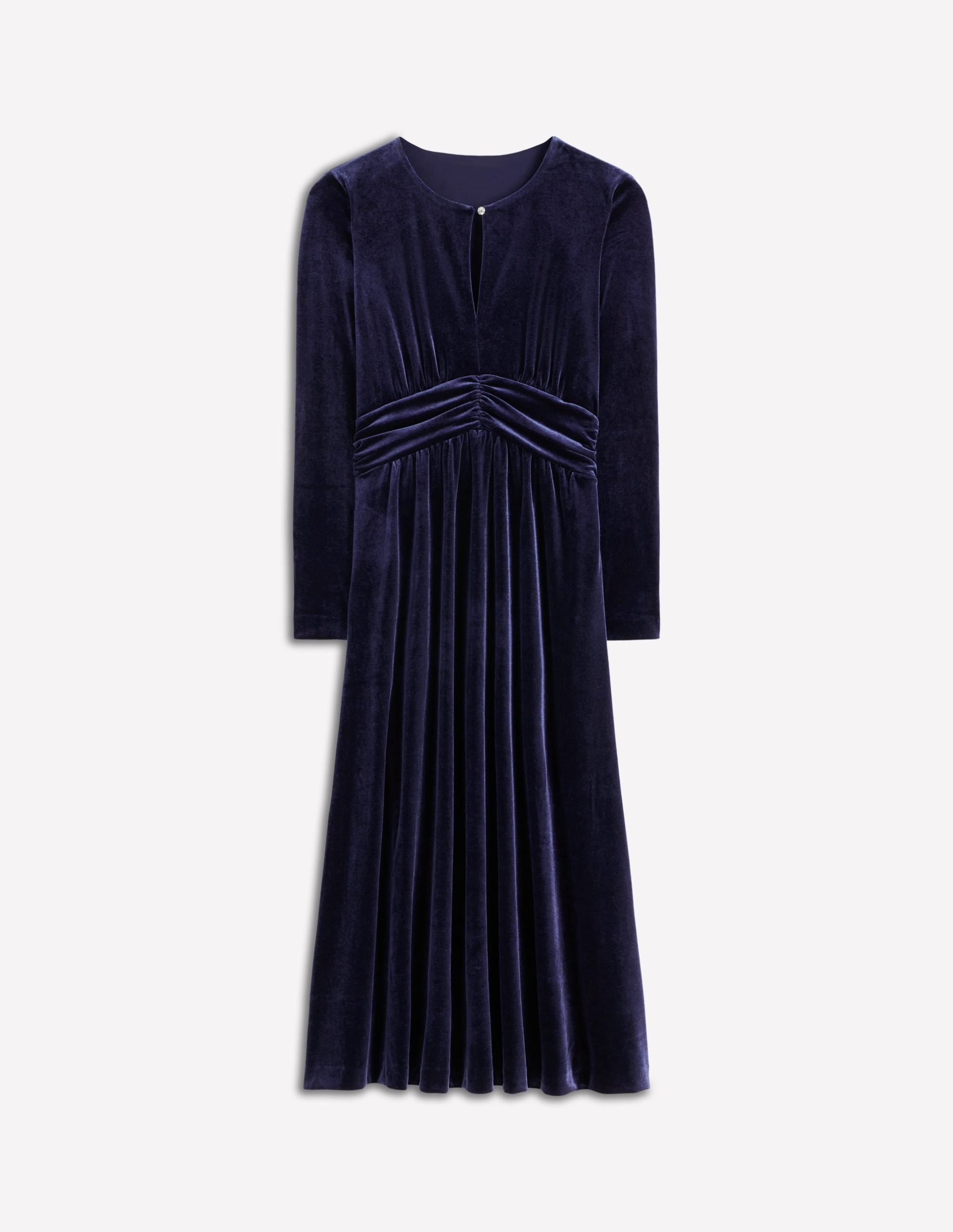 Luxurious and cosy. velvet is always a good idea at this time of year. Our Tilda midi dress has a little stretch for comfort while the long sleeves and ruched waistband flatter all shapes. The epitome of festive elegance.