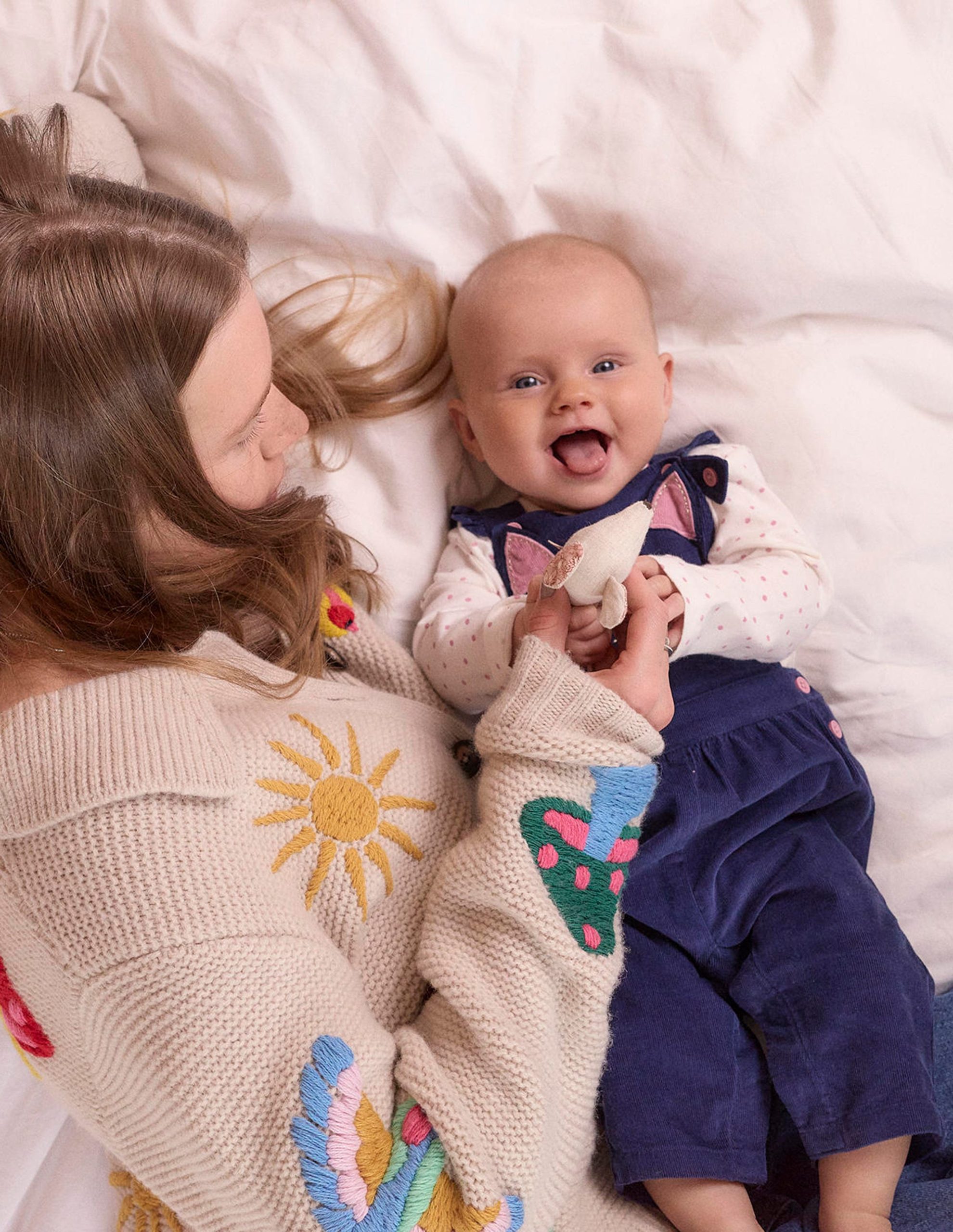 This woven dungaree set is made with the softest cotton. We added frills to the straps and made them adjustable for growing. Choose from floral embroidery or a fun cat design (this clever kitty is hiding the buttons behind their 3D ears).