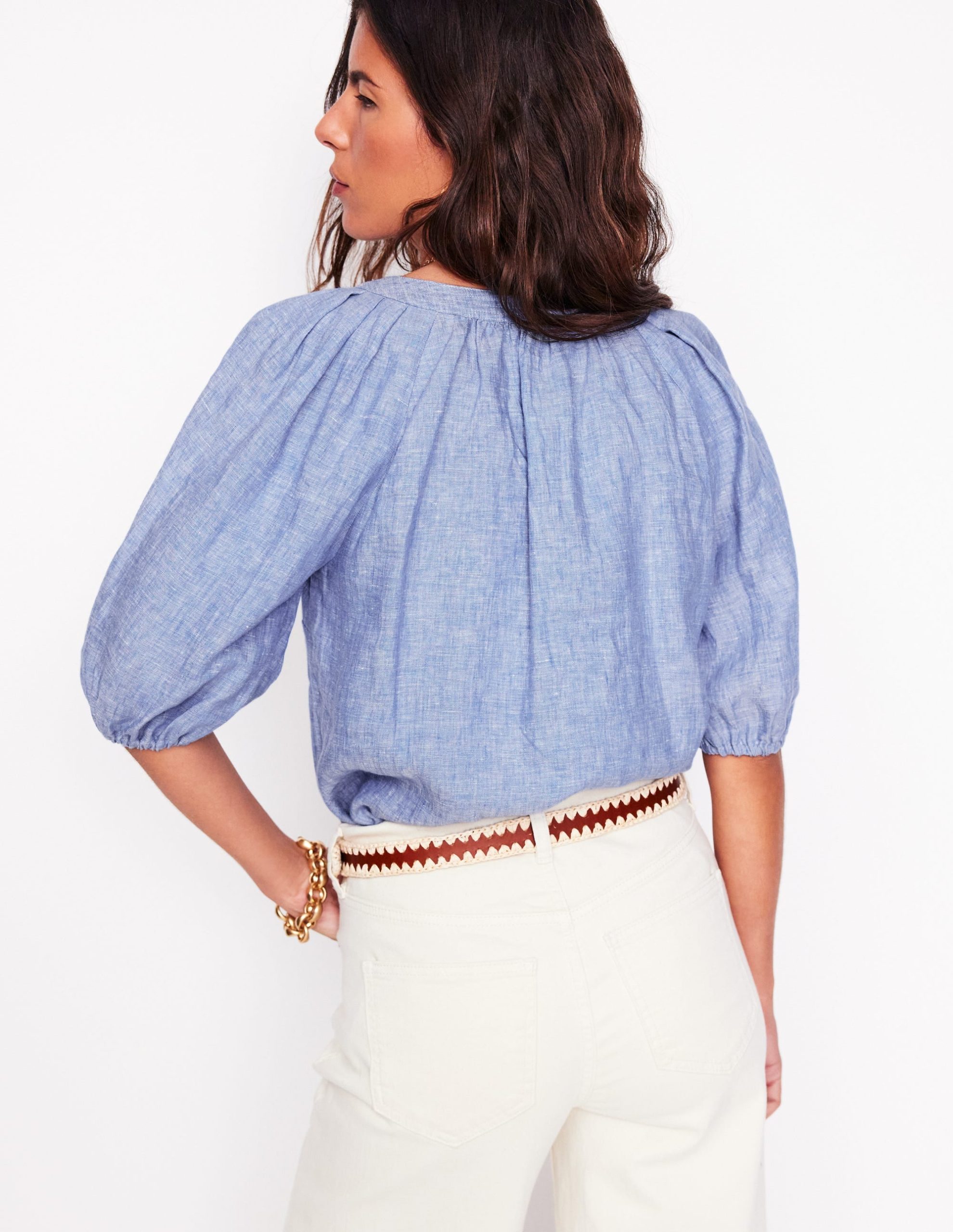 A pure linen top that deserves plenty of airtime this summer. The flouncy sleeves. flattering V-neck and soft gathering makes it the ideal addition to a relaxed weekend look.