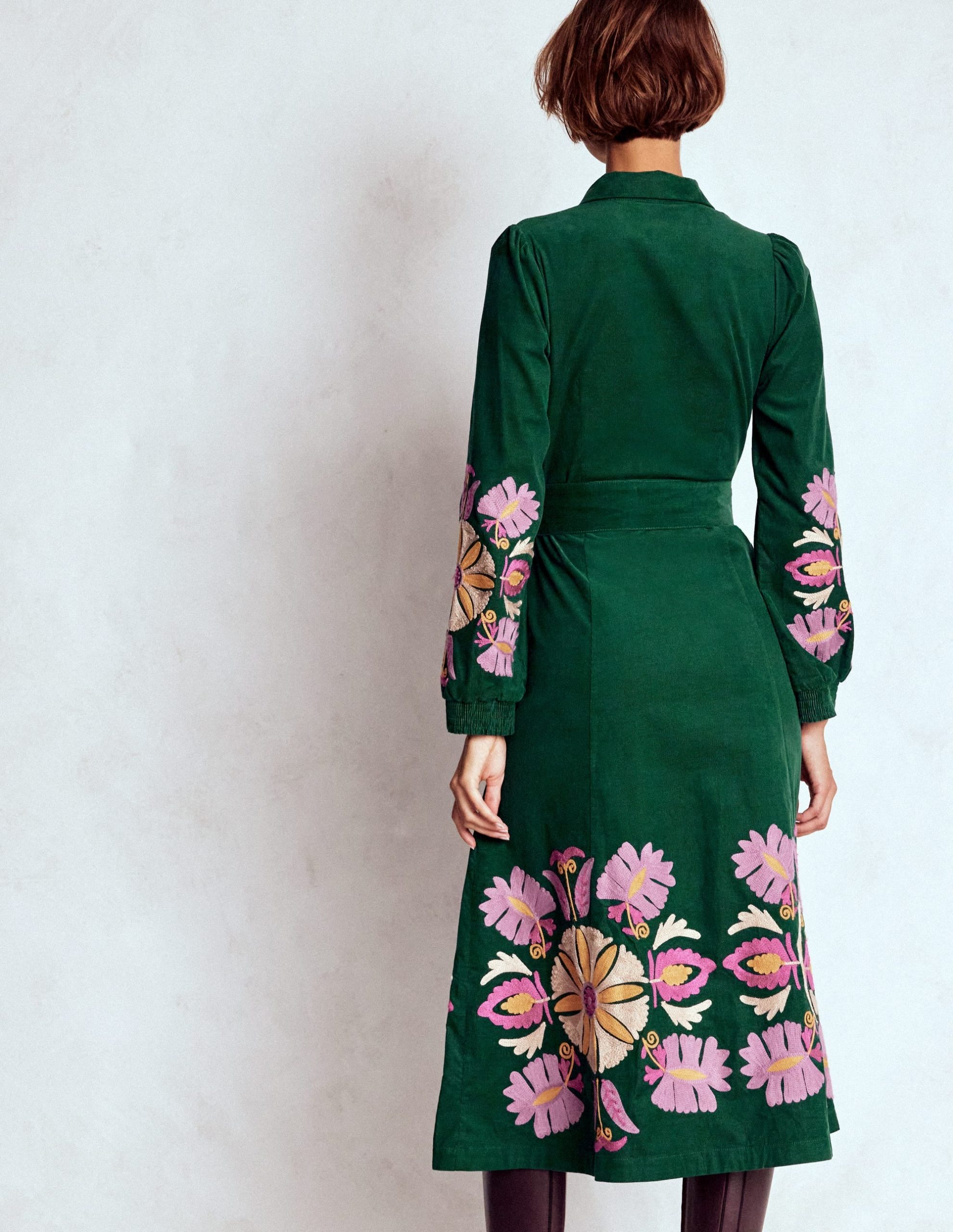 Clara Cord Midi Dress-Emerald Night. Embroidery