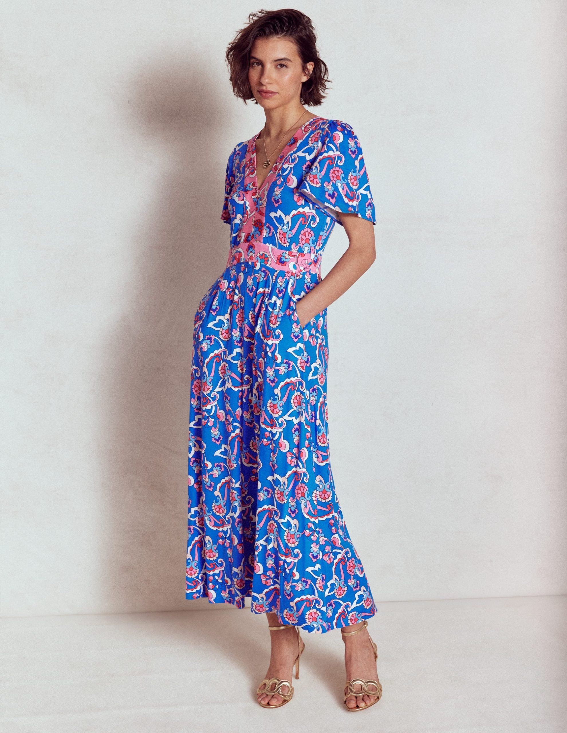 Ellie Flutter Maxi Tea Dress-Kingfisher Blue. Foliage Trail