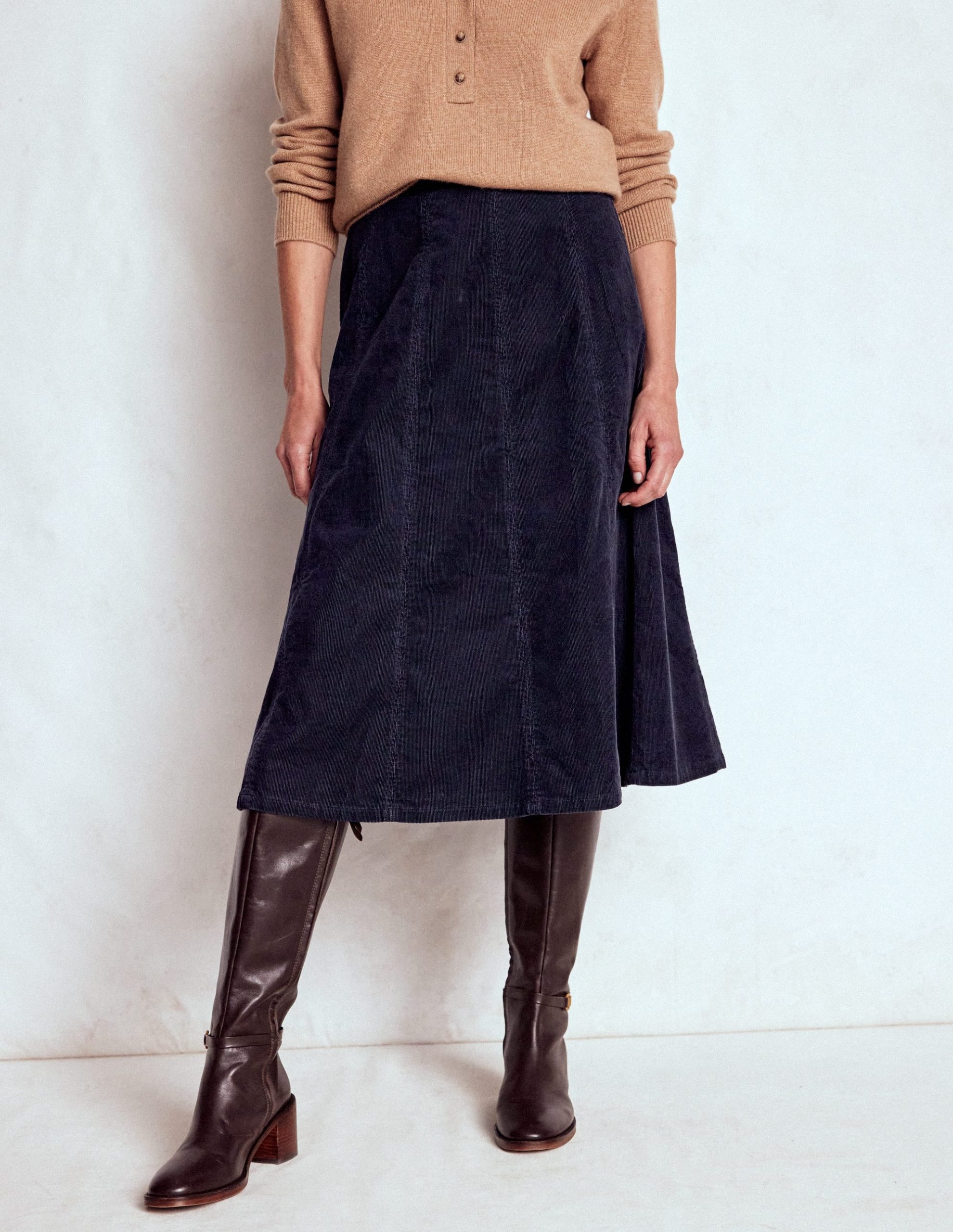 Joy by name. joy by nature. Swoosh through the seasons in our cord midi skirt which comes in lots of lovely colours. We like to team ours with a fitted knit and sleek boots.