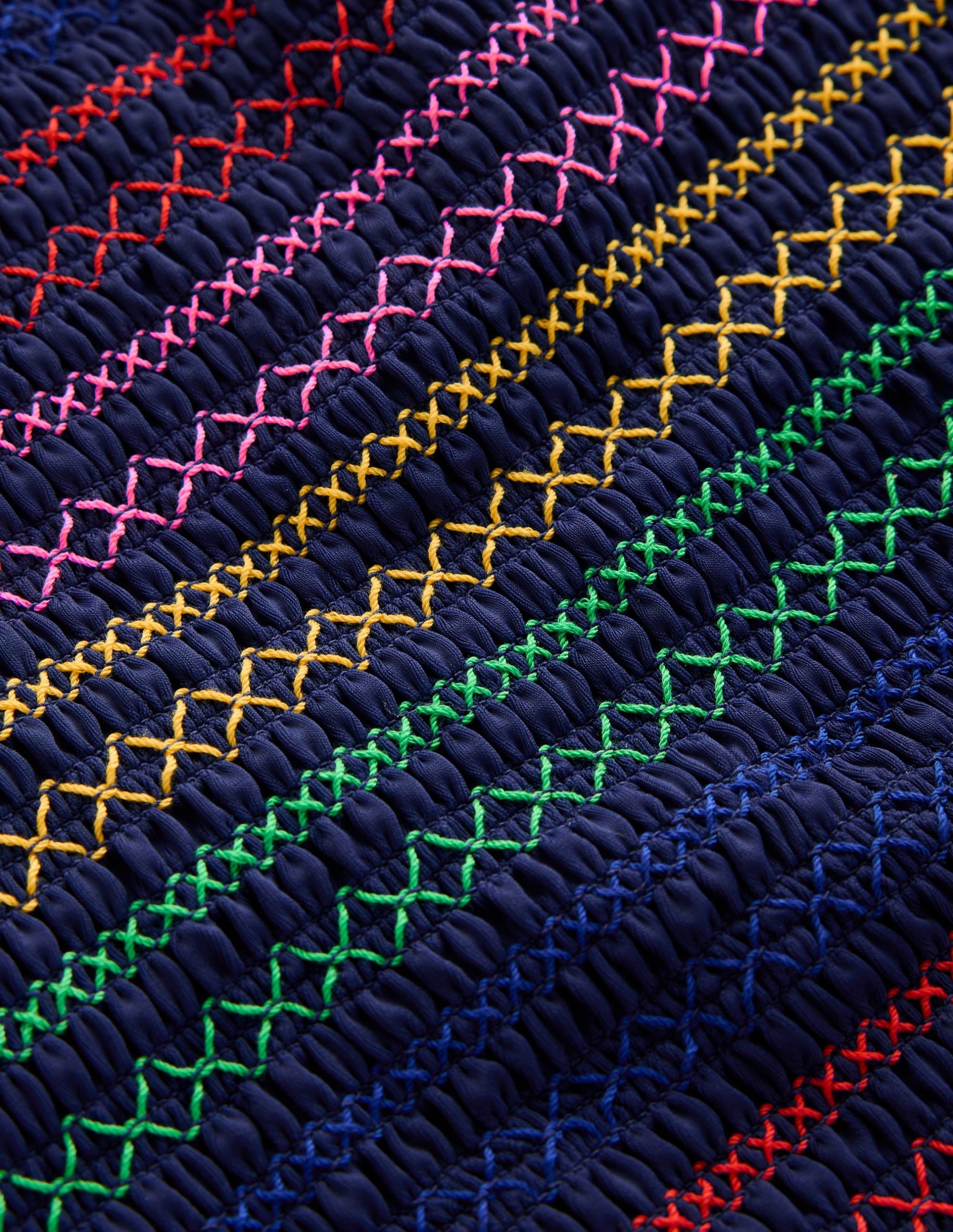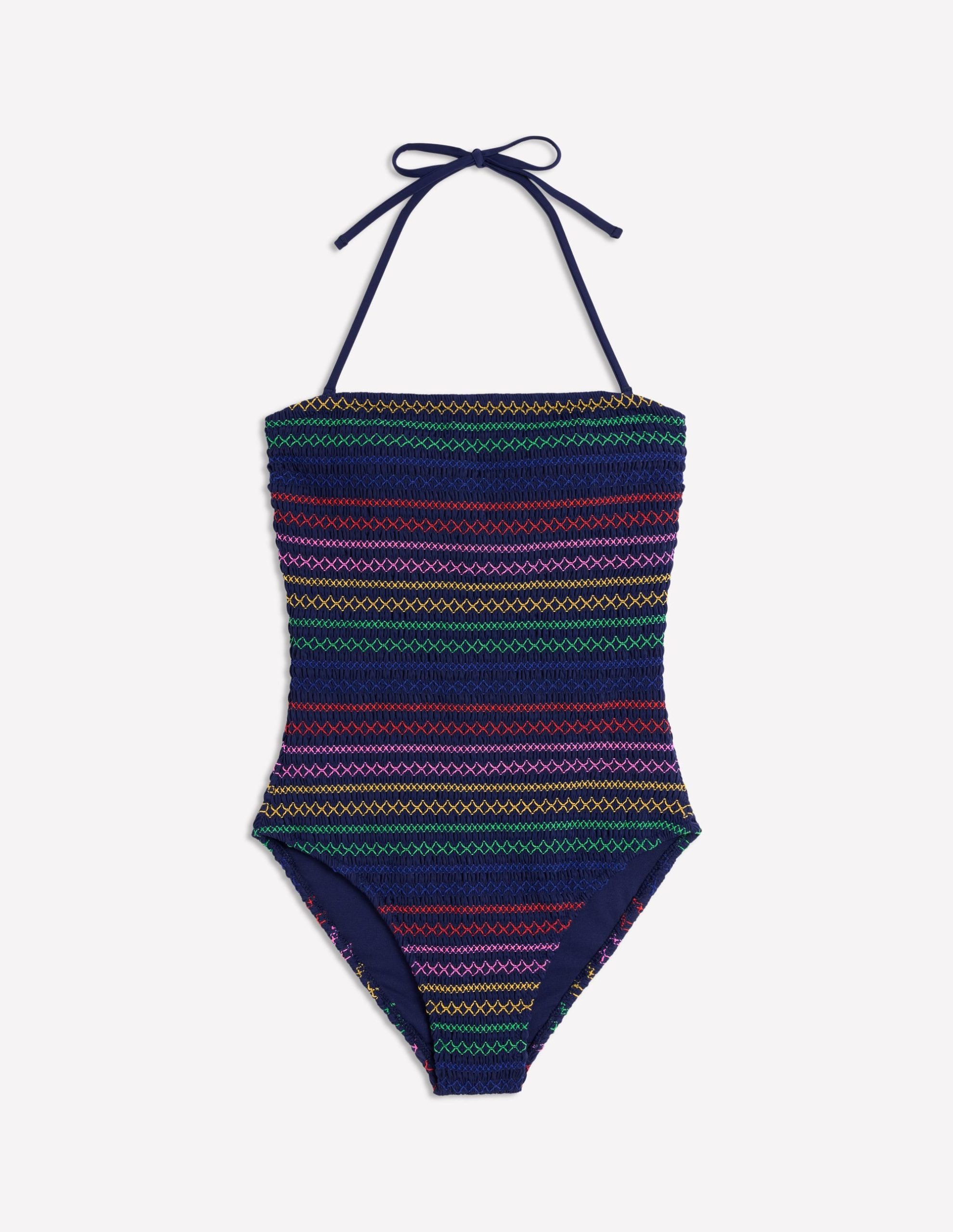 This classic bandeau swimsuit features all-over smocked detailing and a high-leg silhouette. Its fixed cups and silicone tape at the neckline make for a comfortable. supported fit.