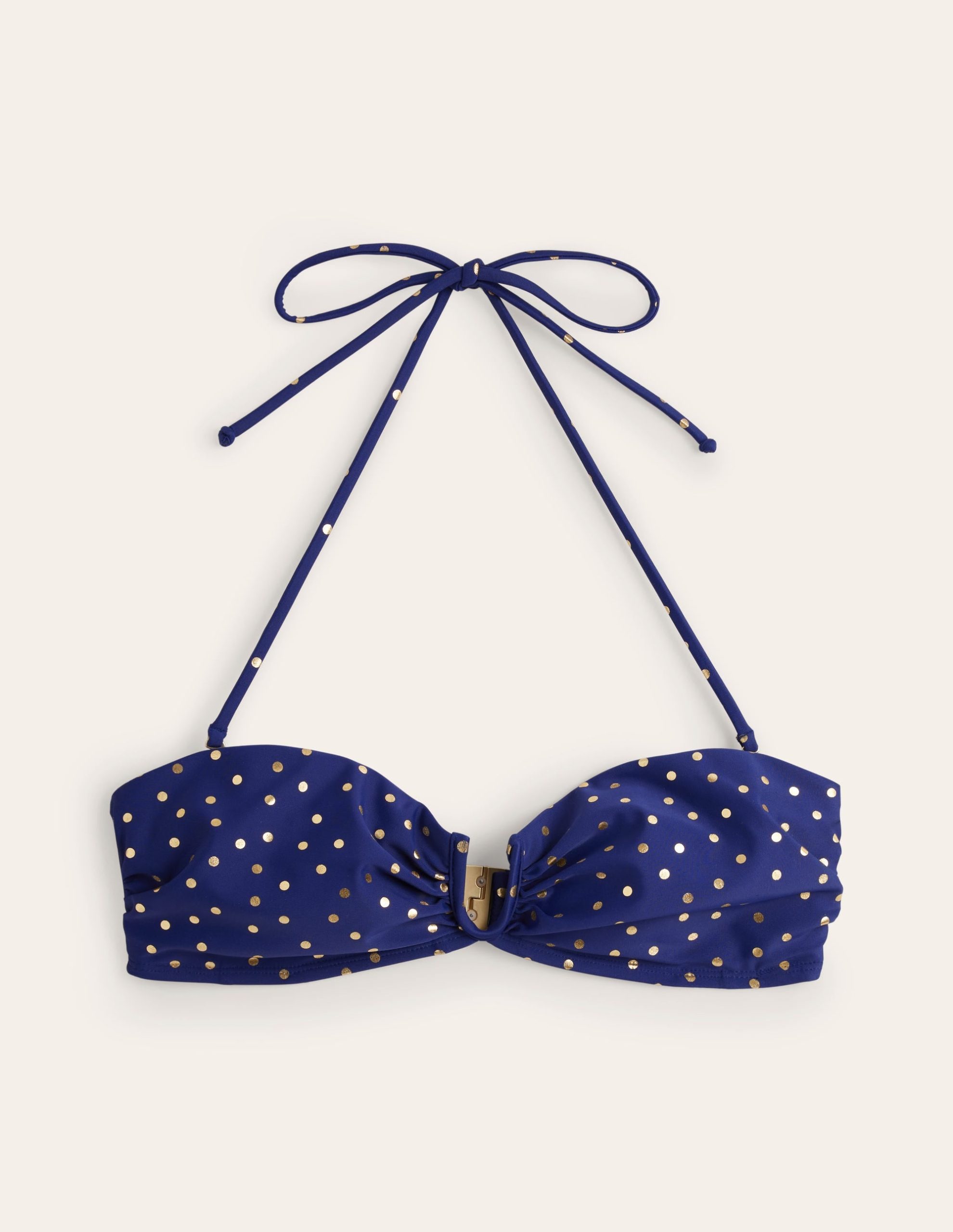 With a U-bar that creates gentle ruching at the bust. this bandeau bikini top has retro charm. Wear it with or without the removable haterneck strap.