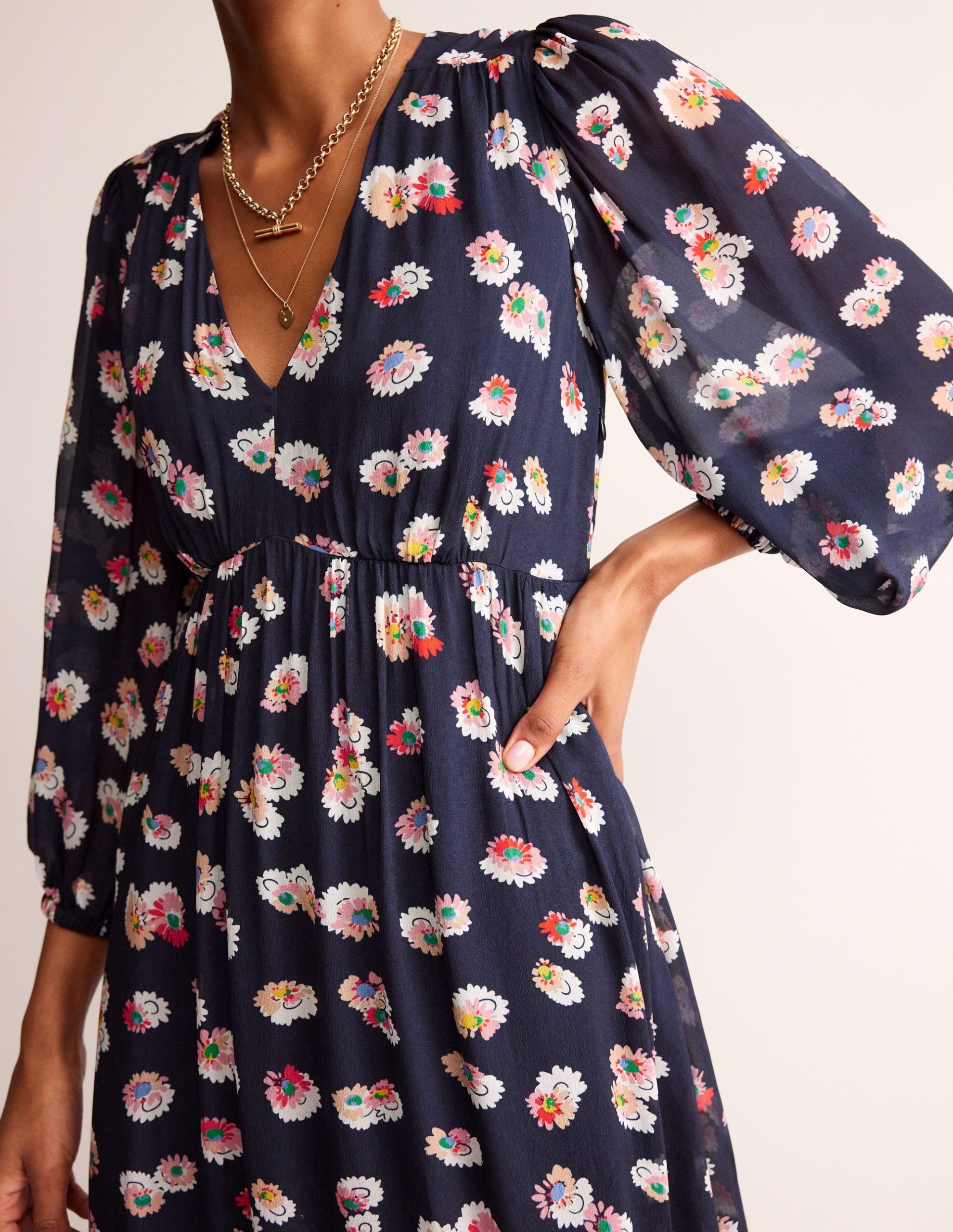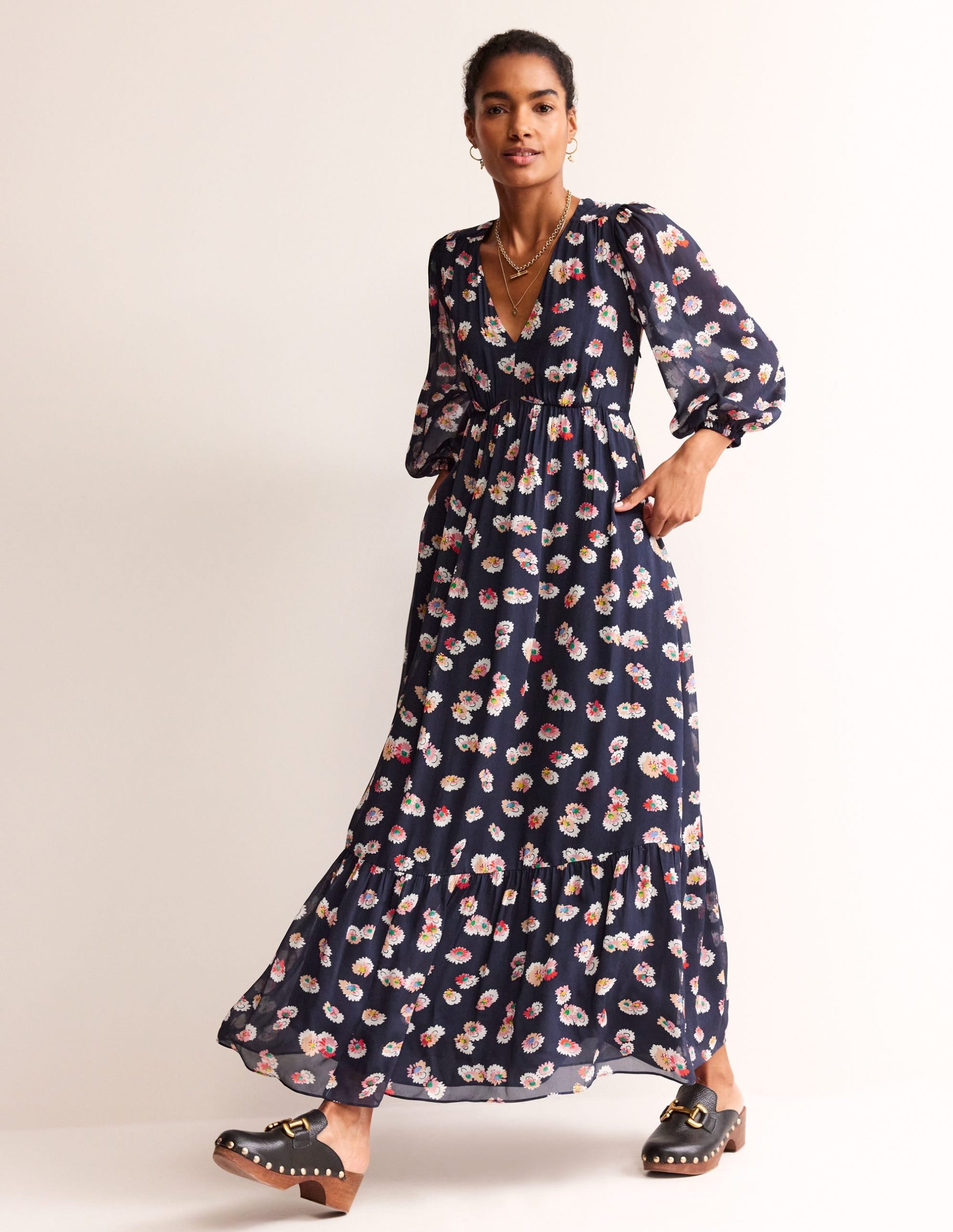 V Neck Puff Maxi Dress-French Navy. Botanical Petal