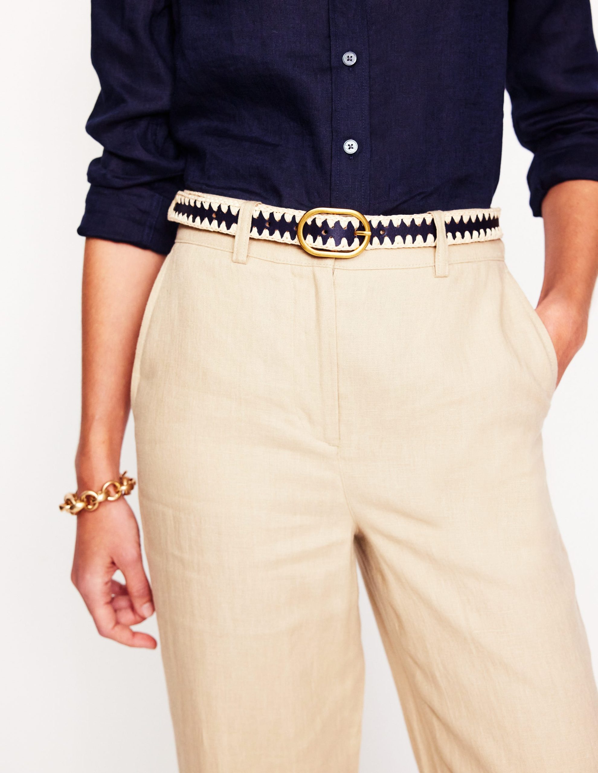 Woven from raffia with contrasting whipstitch trims. this belt will add a bohemian edge to your look. Showcase the round-buckle fastening by cinching it over a flowy dress.